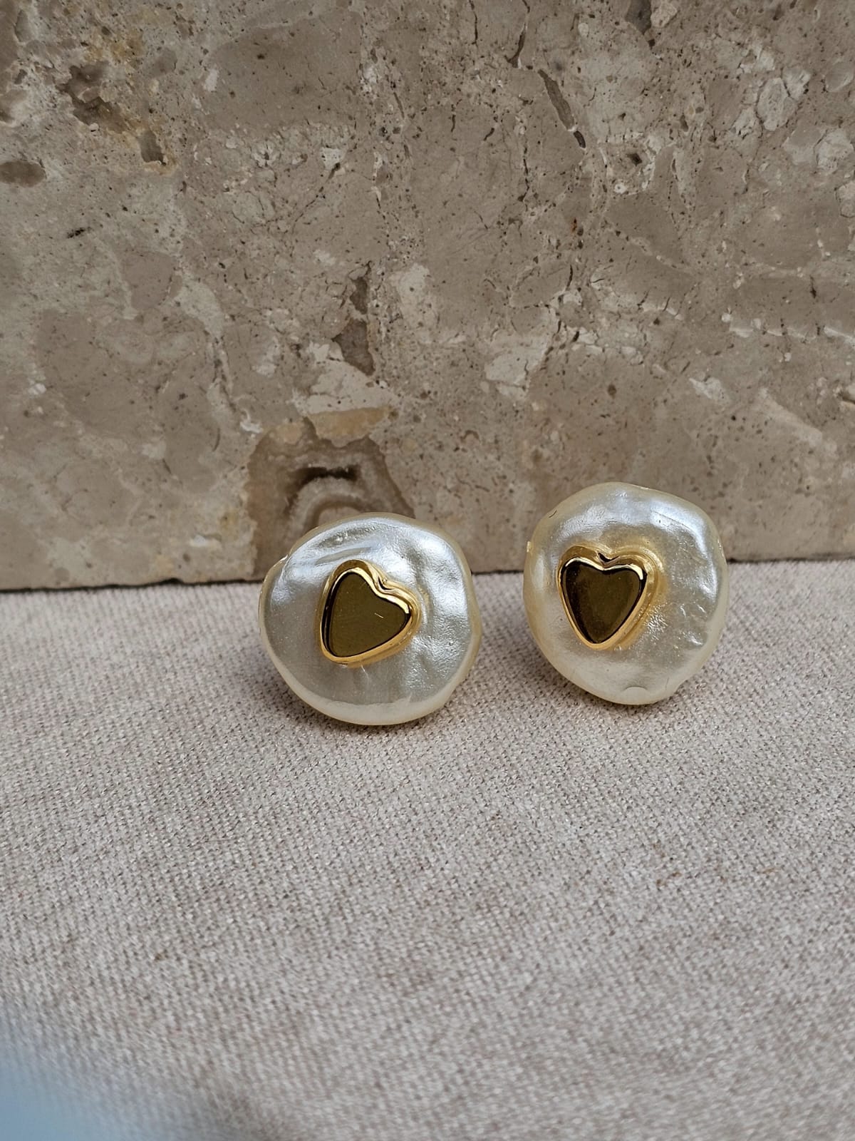 brinco feito em pérola martelada com detalhe em coração dourado sobreposto