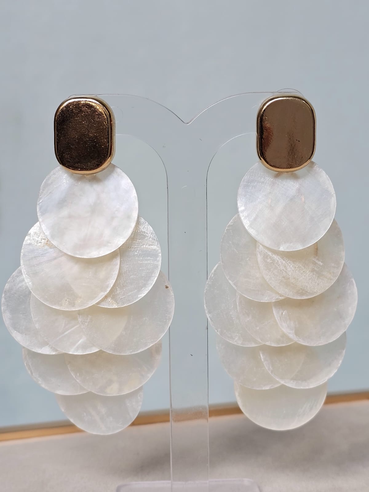 Brinco de escama de madreperola reondada com base de pino em dourado