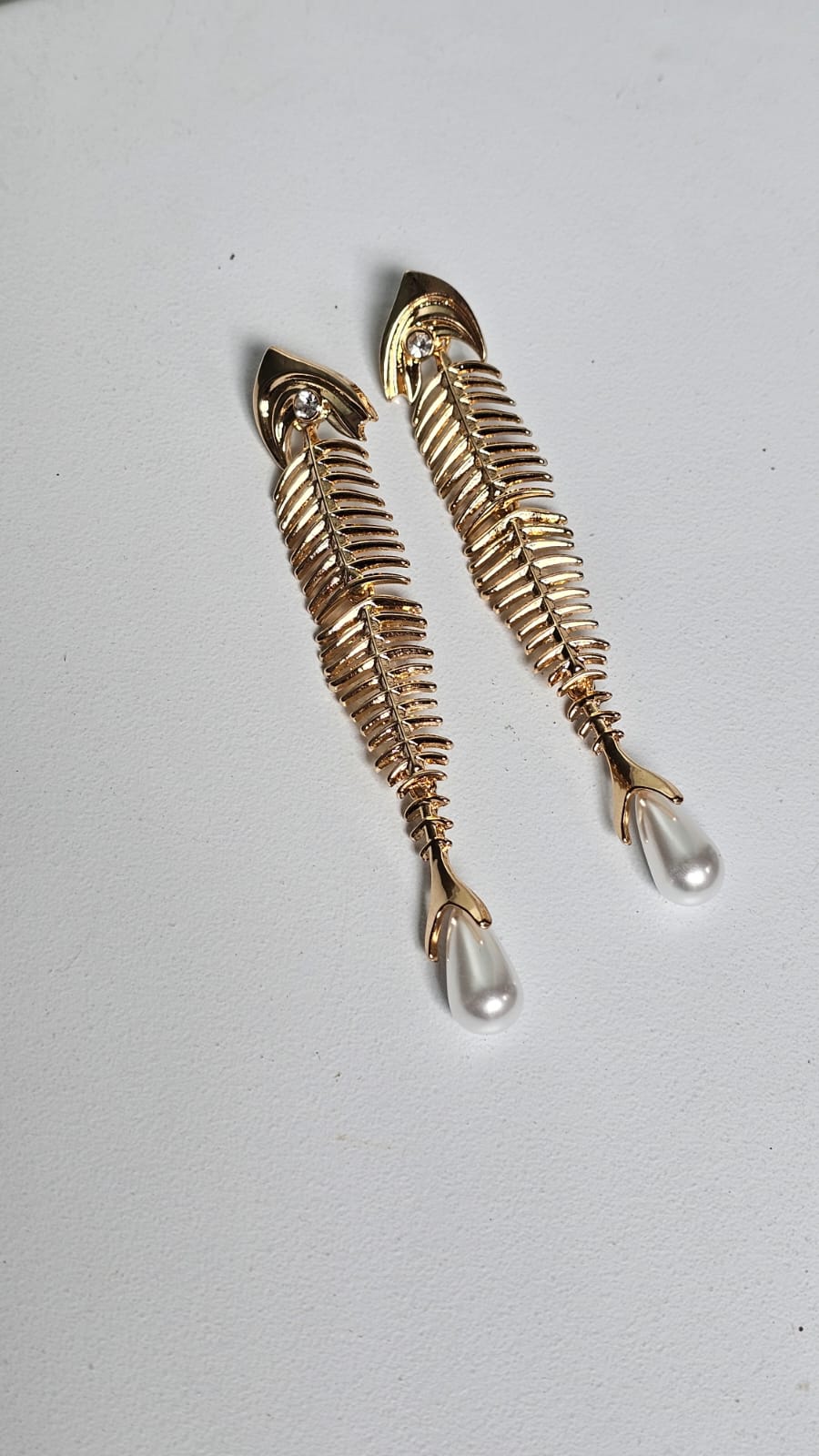 O corpo metálico dourado possui detalhes vazados que remetem à silhueta de uma espinha de peixe, finalizado com uma delicada pérola em formato de gota que traz movimento e um brilho suave ao rosto.