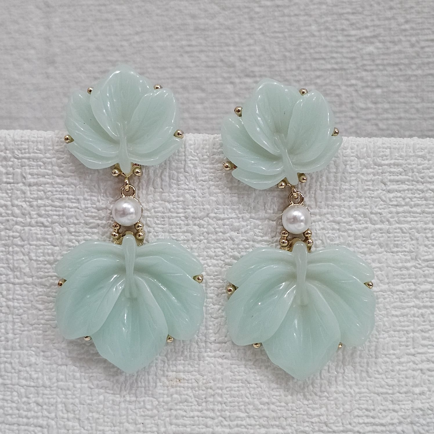 Brinco de flor em duas camadas com caixaria em dourado, detahes em pedra e aplique de for em acrílico