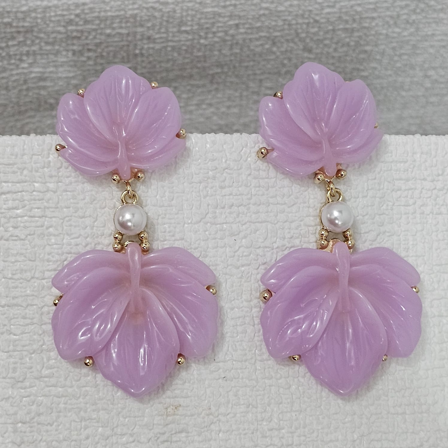 Brinco de flor em duas camadas com caixaria em dourado, detahes em pedra e aplique de for em acrílico