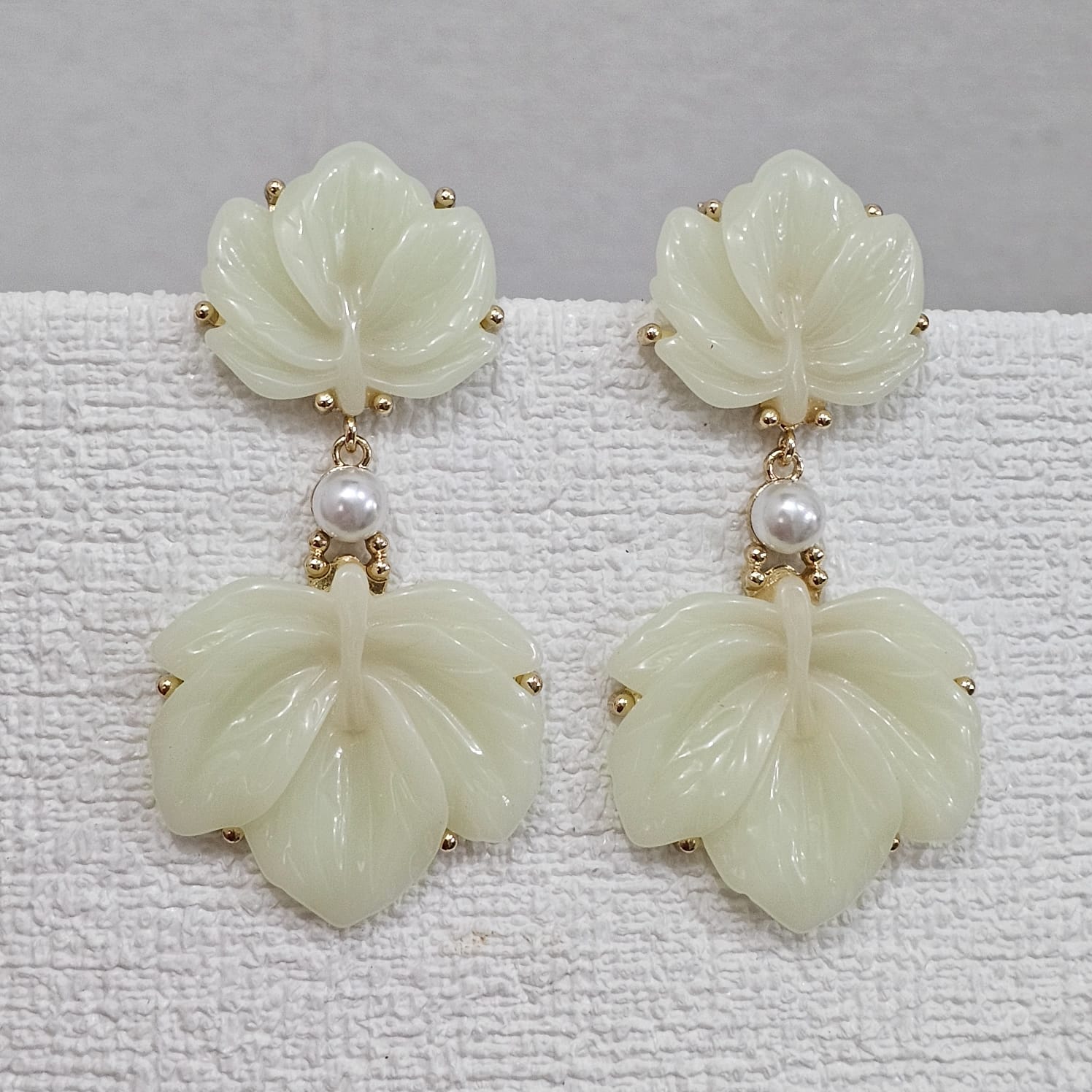 Brinco de flor em duas camadas com caixaria em dourado, detahes em pedra e aplique de for em acrílico