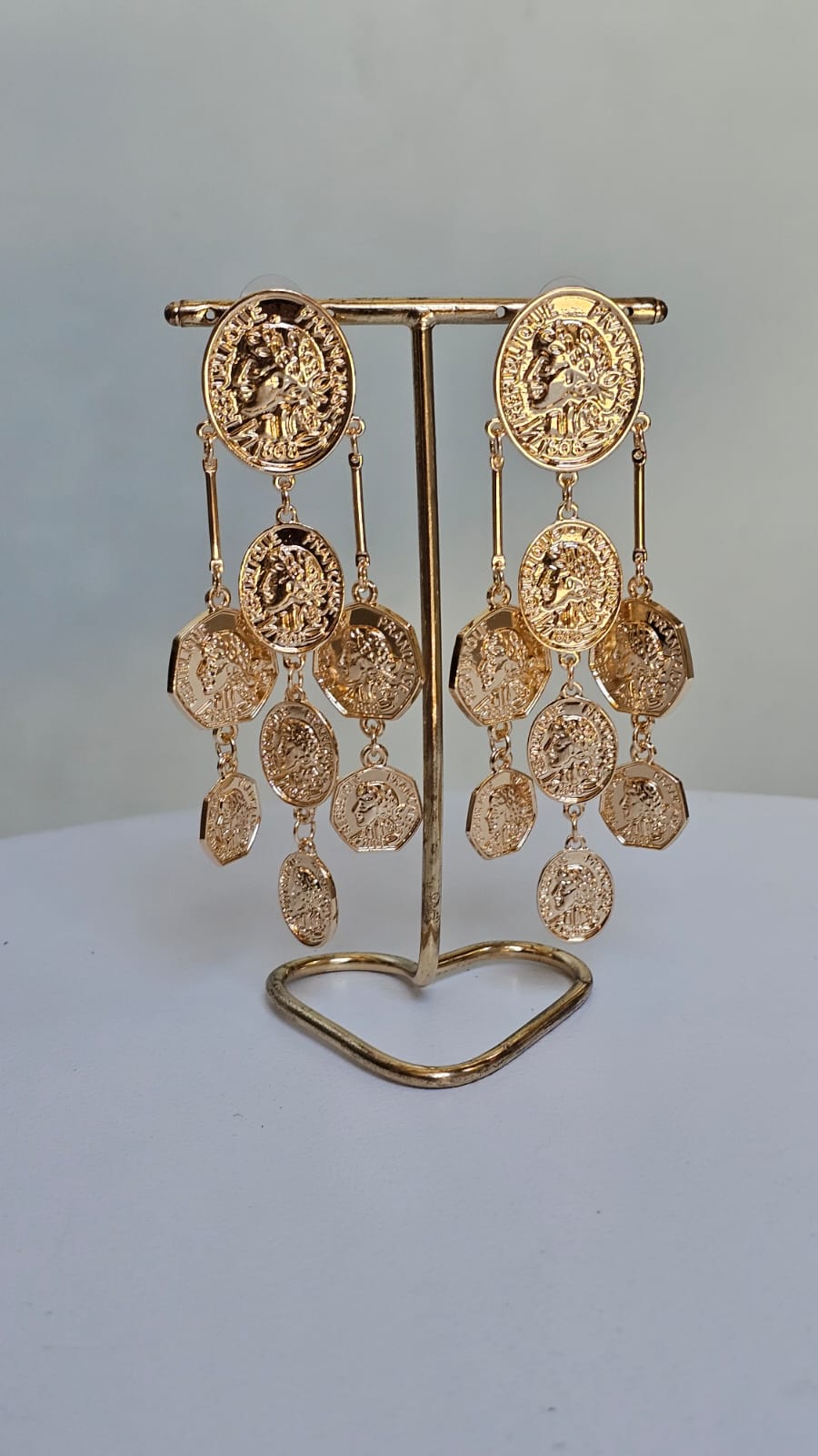 Seja o centro das atenções com o deslumbrante Maxi Brinco Medalhas. Esta peça icônica combina a elegância do dourado com o charme vintage das moedas em cascata, criando um acessório rico em detalhes, movimento e brilho.