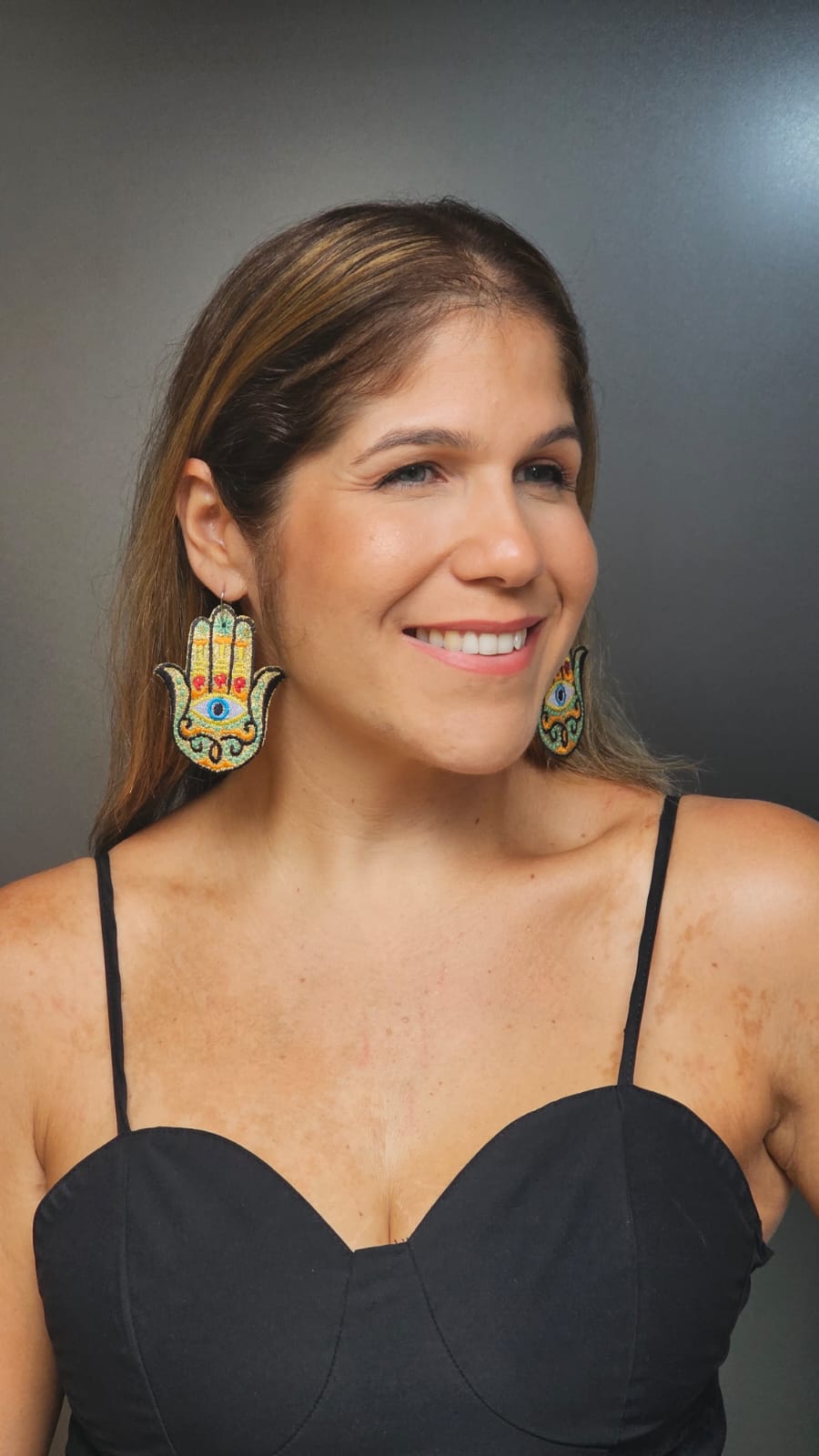 Brinco estilo boho com pino de prata e pingente da "Mão de Fátima" ou "Hamsa", bordado com detalhes nas cores verde, laranja, vermelho, preto, amarelo, branco e dourado.