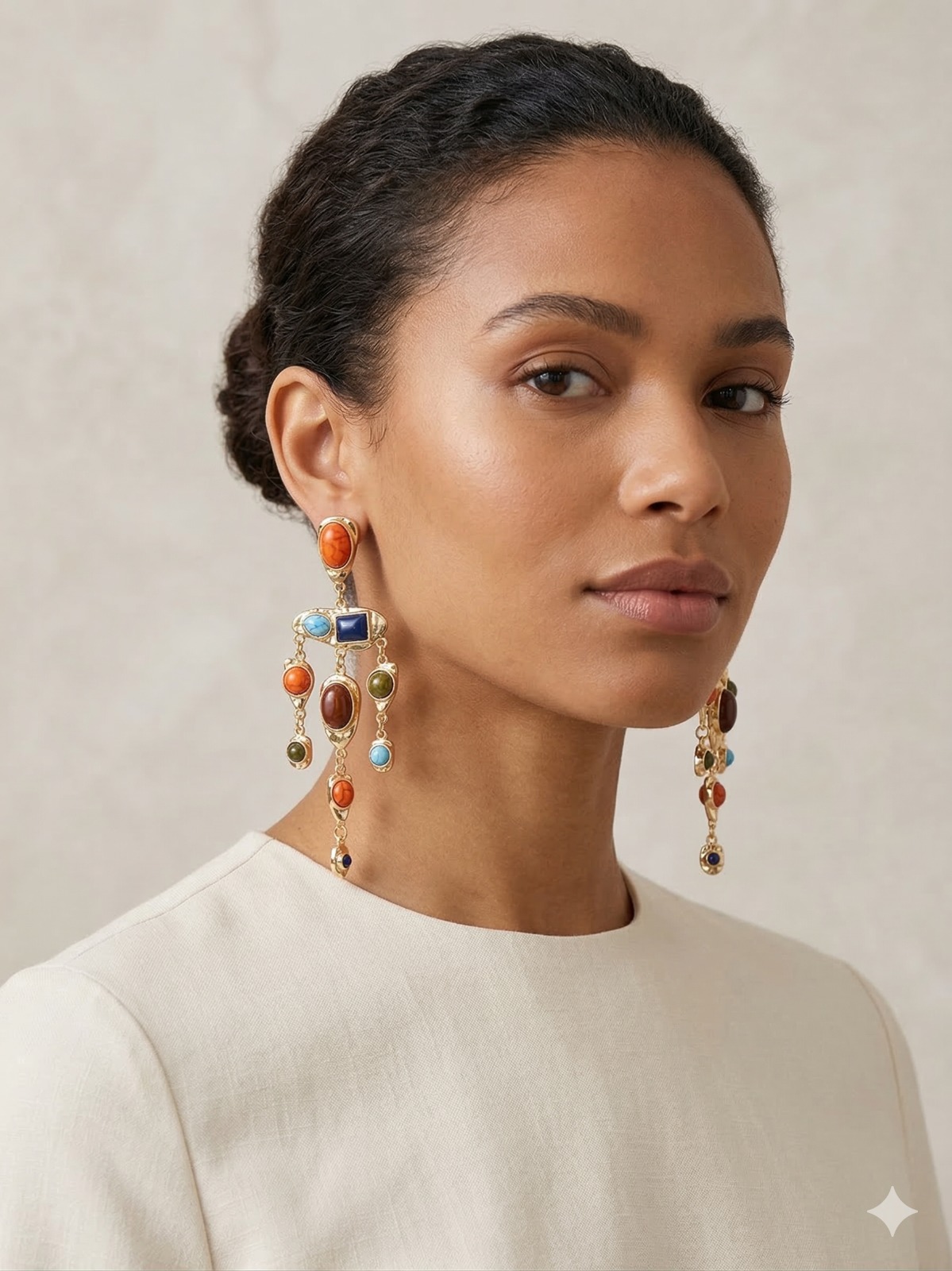 Destaque sua beleza com o Brinco Mosaico. Com comprimento extra longo e design articulado, ele oferece presença máxima sem abrir mão da elegância. As pedras coloridas contrastam lindamente com o banho dourado, criando um acessório versátil que transita do dia para a noite.