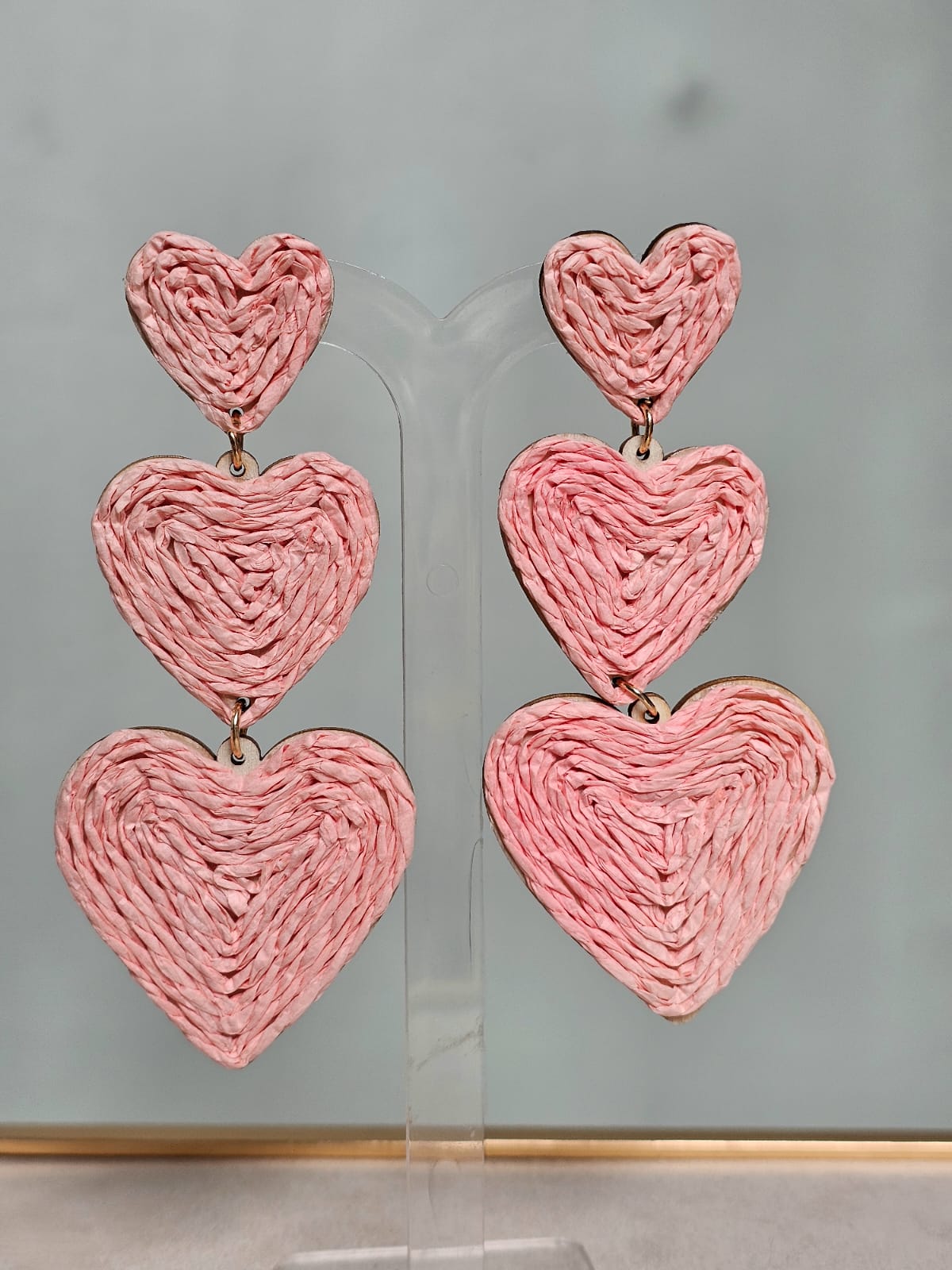 Brinco ráfia corações rosinha
