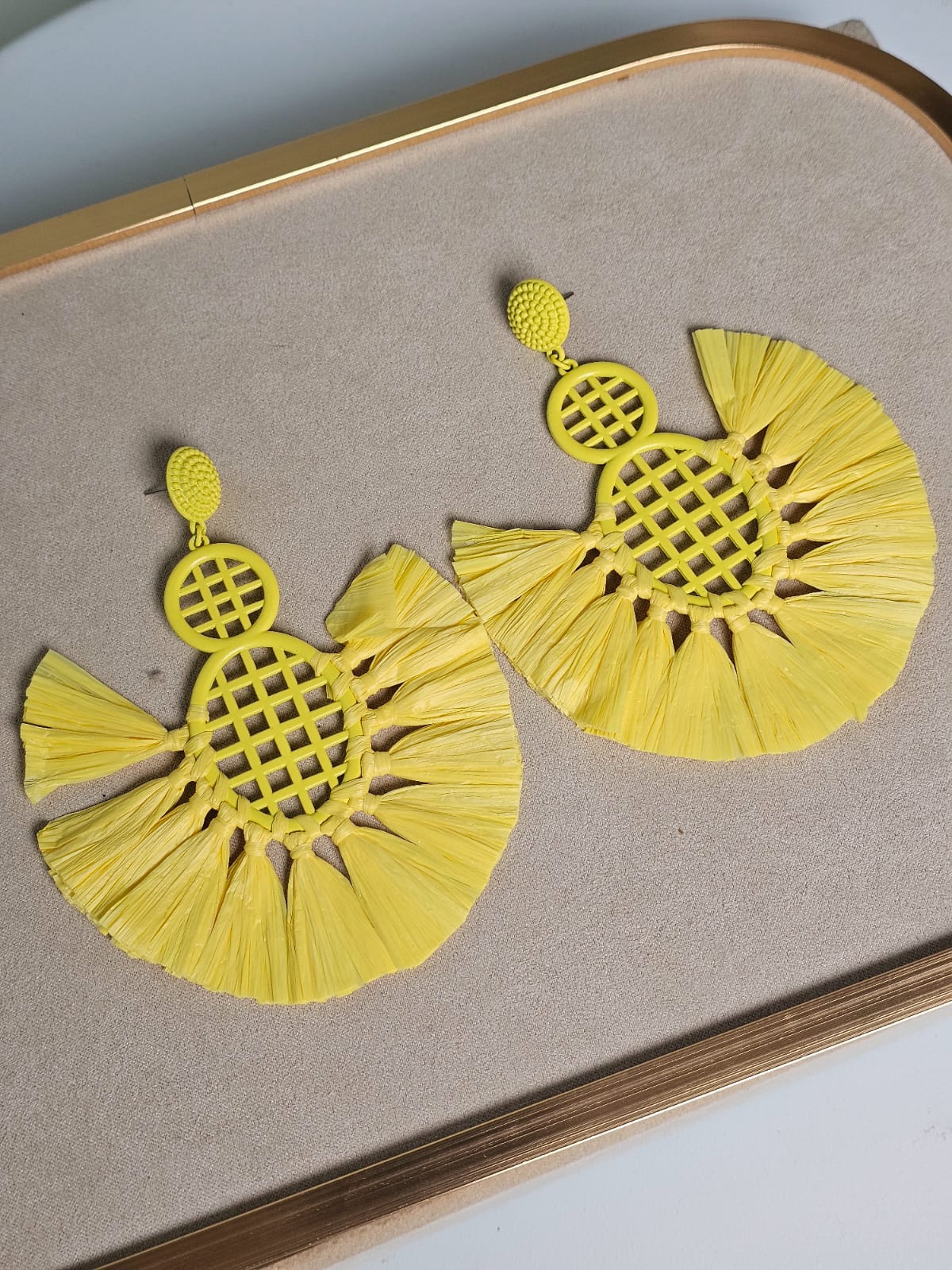 brinco com metal pintado e detalhes em paha de ráfia colorida