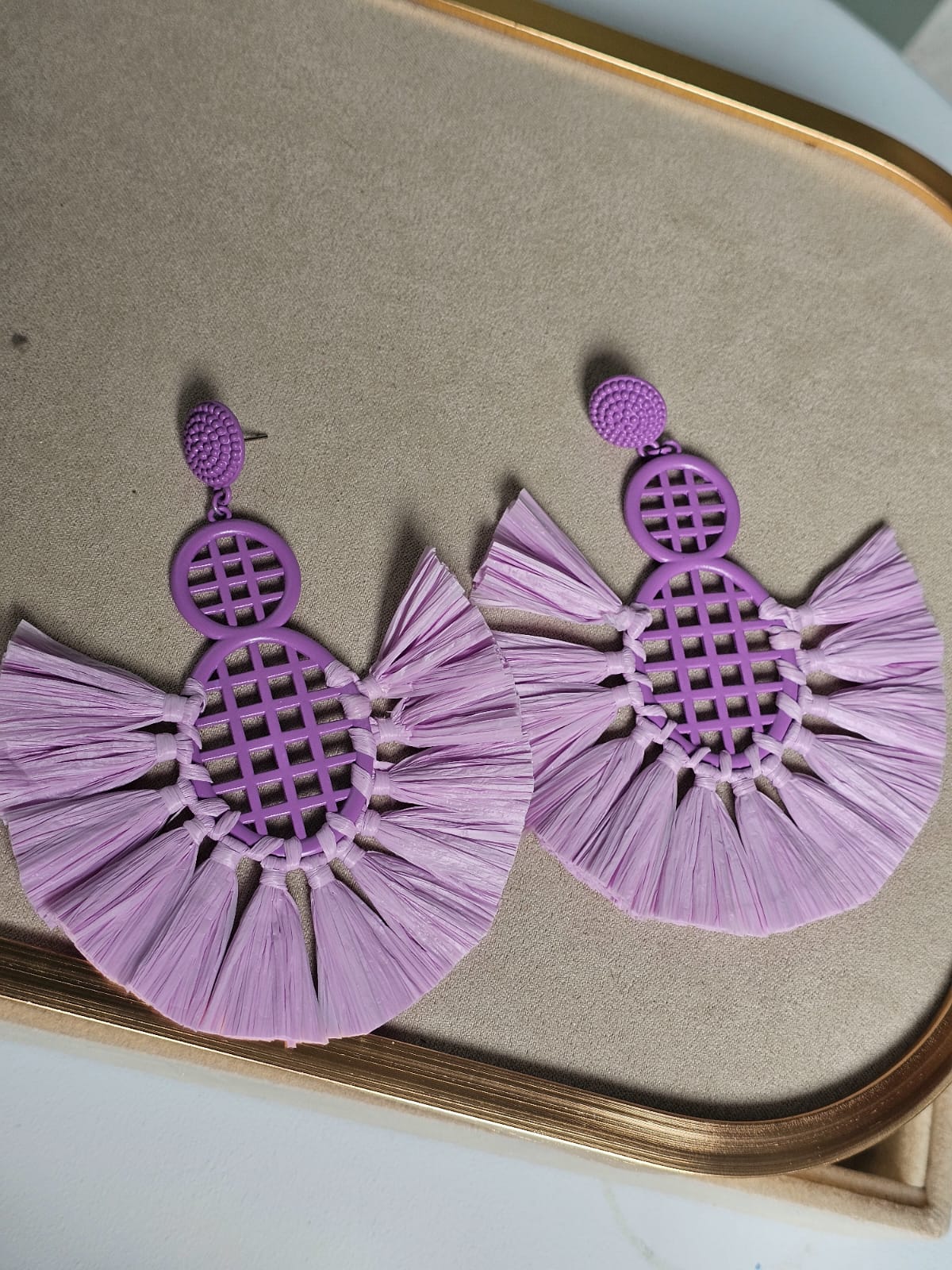 brinco com metal pintado e detalhes em paha de ráfia colorida