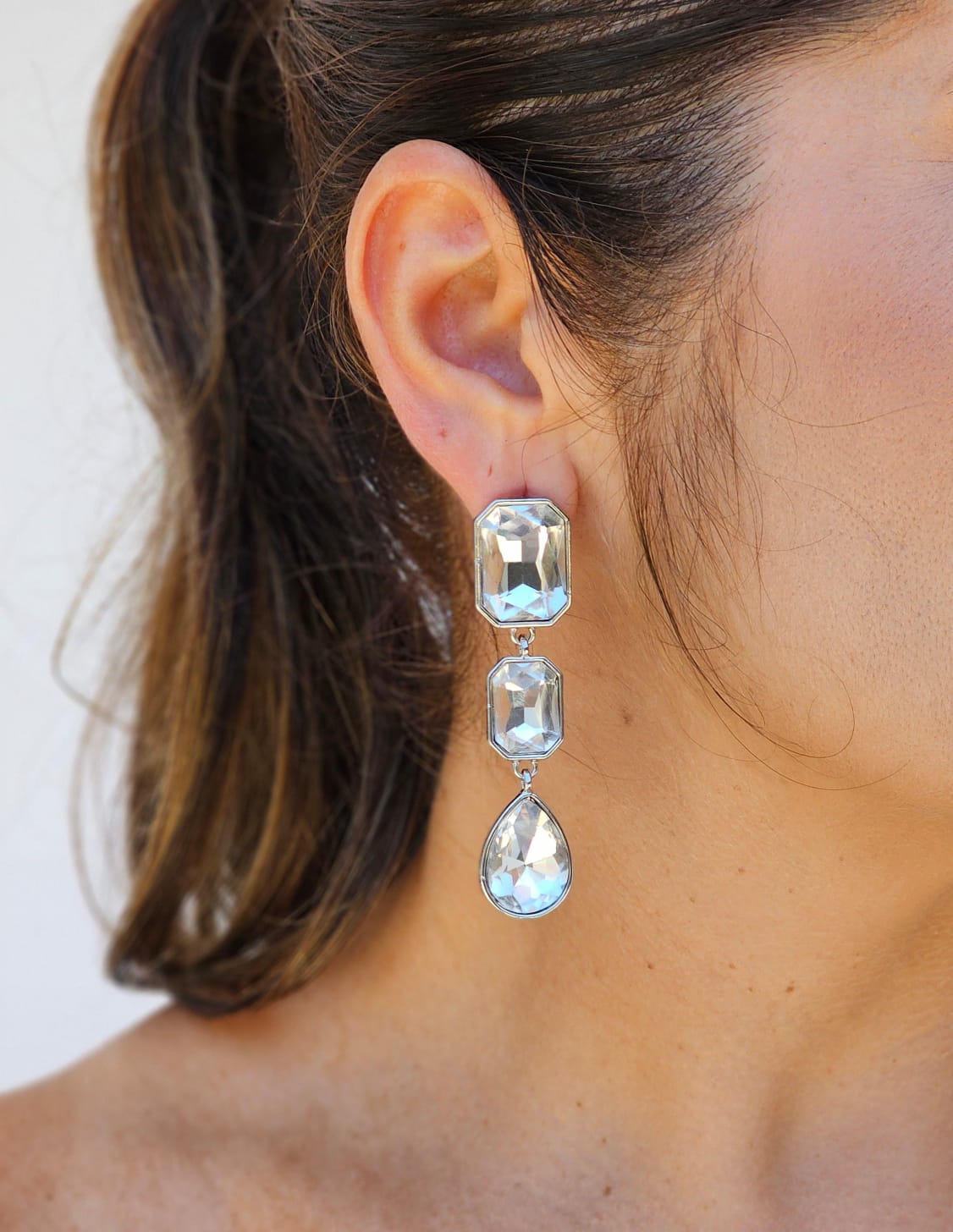 Brinco articulado em três camadas com aplicação de chatom de vidro na cor dourada