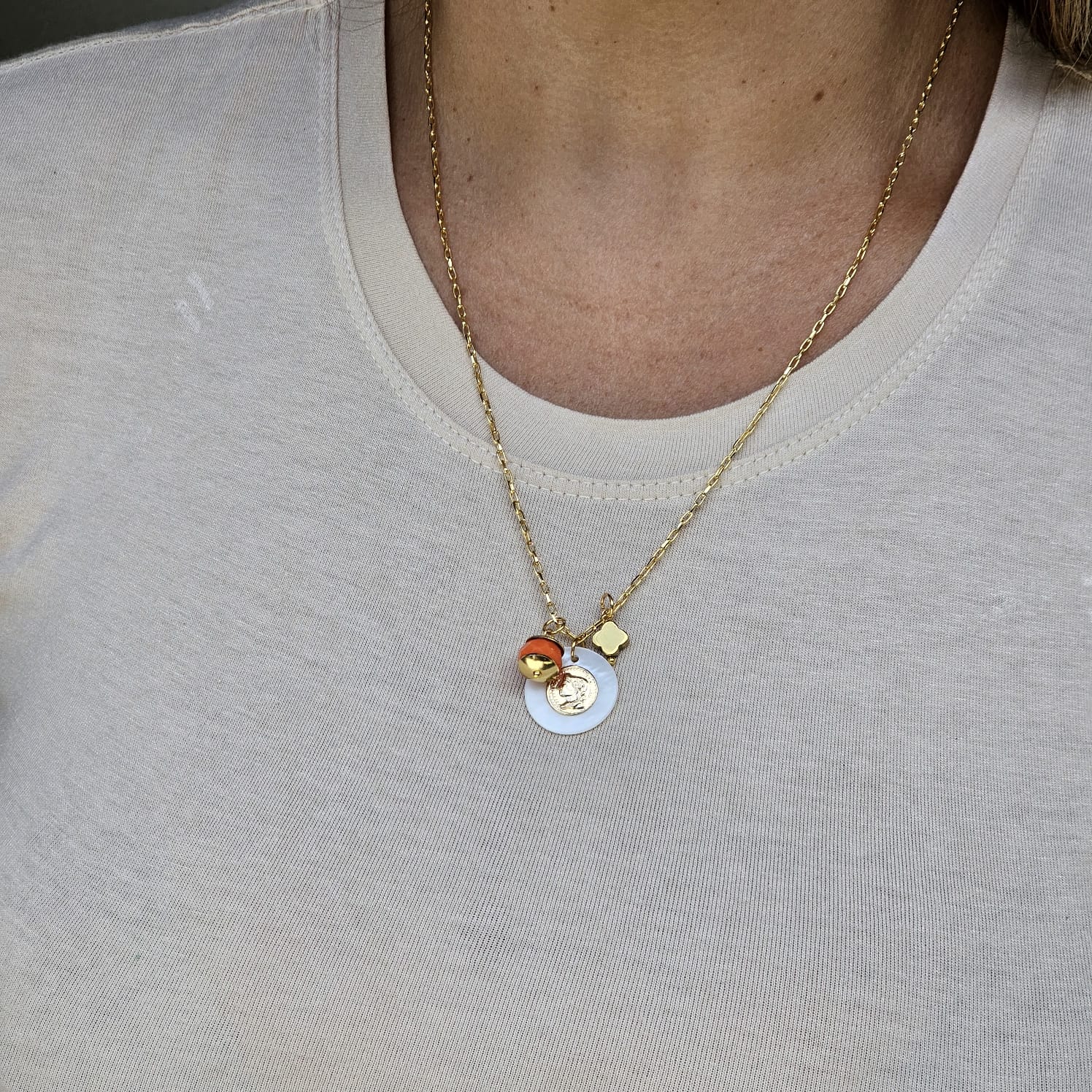 Colar corrente com pingente contendo madrepérola com emblema de moeda, trevo de pedra de hematita e pedra de cristal facetado