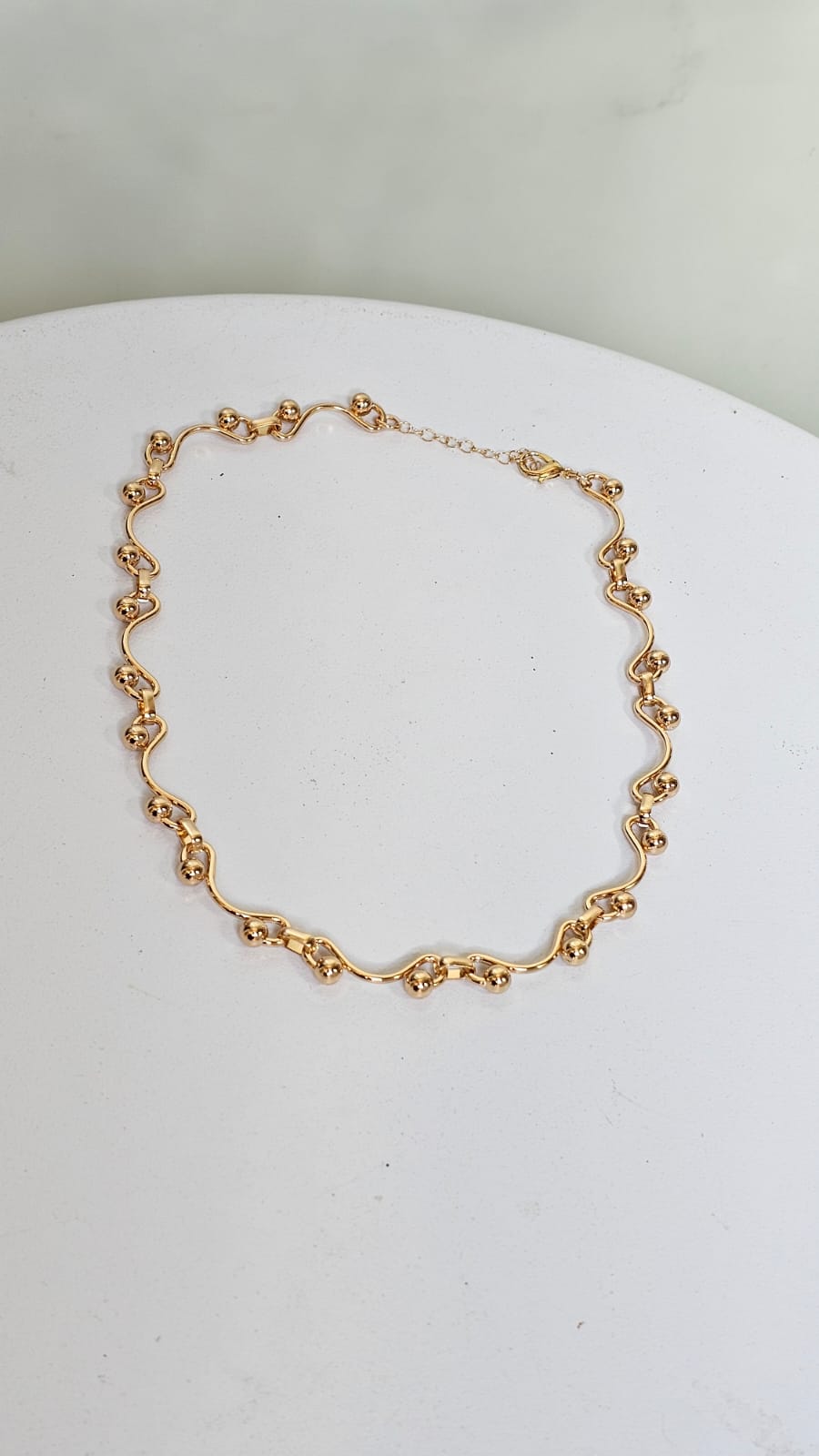 Adicione um toque de originalidade e brilho ao seu colo com o nosso Colar Choker Ondulado. Esta peça apresenta um design inovador, composto por elos sinuosos que se interconectam com pequenas esferas polidas, criando um visual de movimento e elegância.