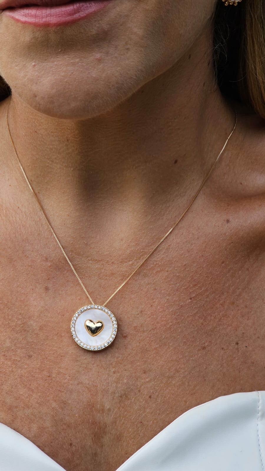 Este colar é a escolha perfeita para quem busca um toque de romantismo e sofisticação no dia a dia. Com um design atemporal, ele combina a suavidade do fundo em madrepérola (efeito resina) com o relevo de um delicado coração dourado, tudo emoldurado por uma cravação de mini cristais que garante um brilho especial à peça.