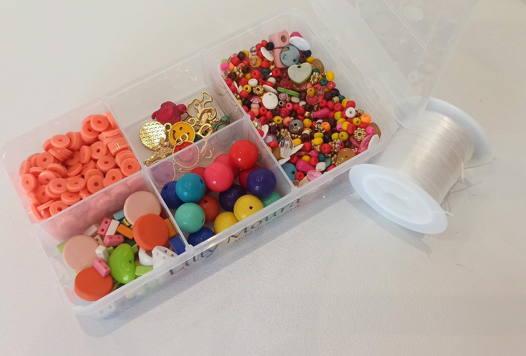 Caixinha com divisórias recheadas de miçangas e pingentes para que a criança libere o lado criativo e criei suas próprias peças.