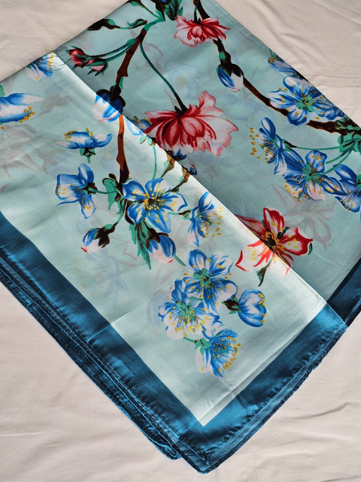 Lenço de Cetim com estampa de flores e barrado de cor intensa