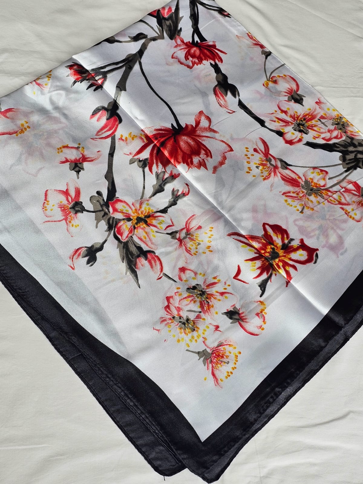 Lenço de Cetim com estampa de flores e barrado de cor intensa