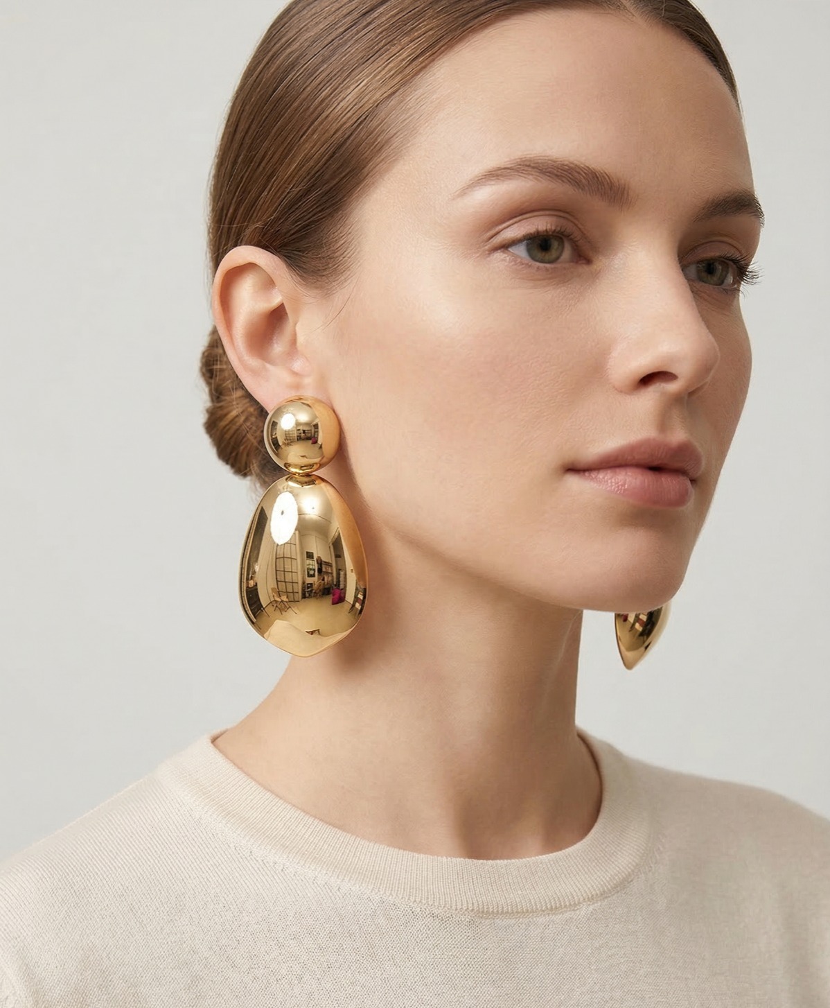 Esta peça é uma verdadeira declaração de estilo, medindo impressionantes 8 cm de comprimento. O design contemporâneo apresenta duas esferas douradas sobrepostas, com um acabamento polido de alto brilho que reflete a luz de maneira espetacular, criando um visual arrojado e sofisticado.