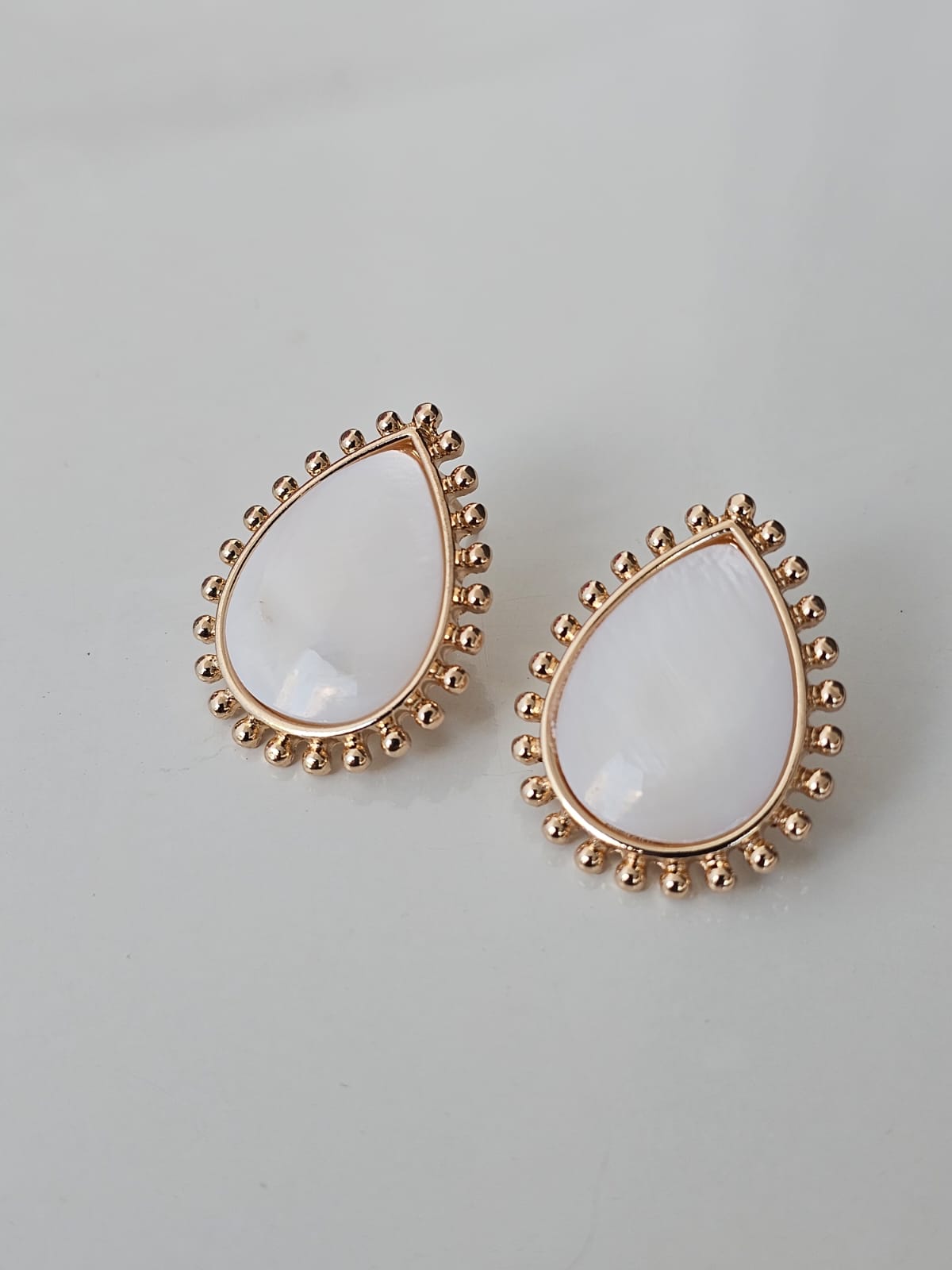 Brinco em formato de gota com pinos ao redor e pedra central em madreperola