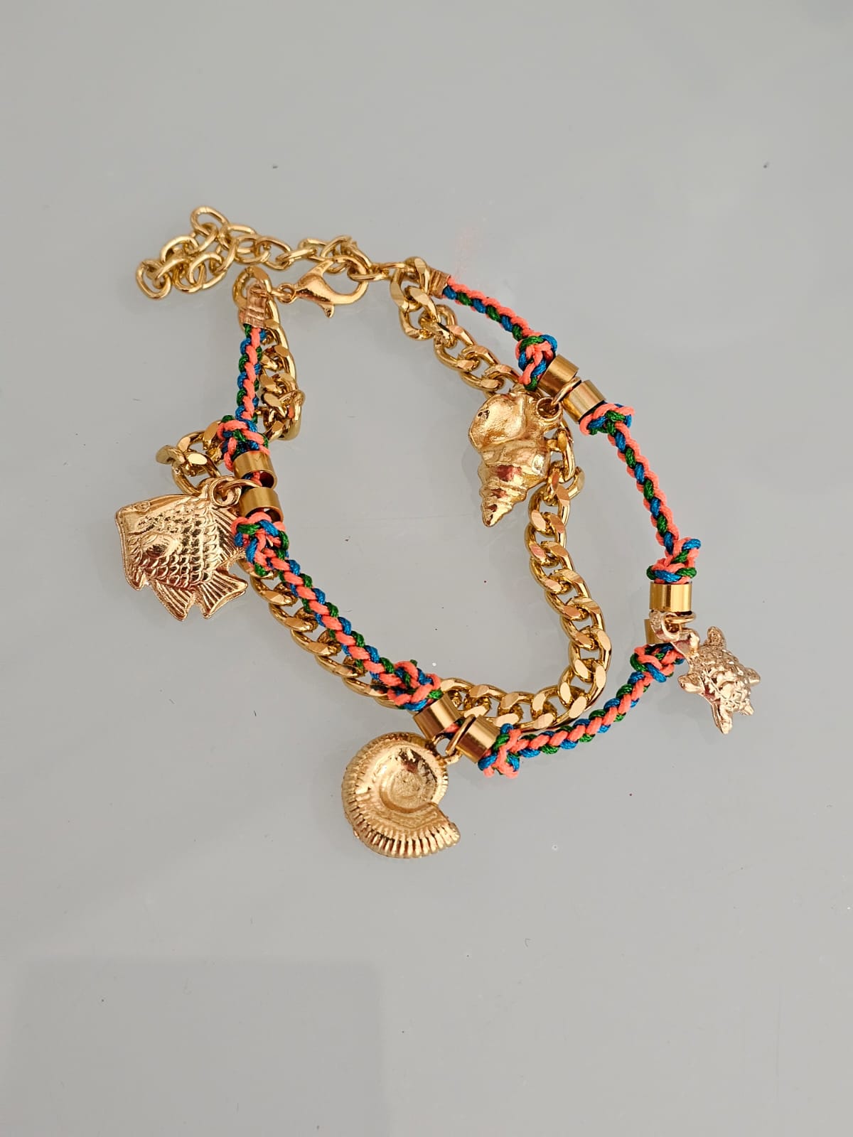 Pulseira dupla composta por fio colorido com pingente e corrente dourada.