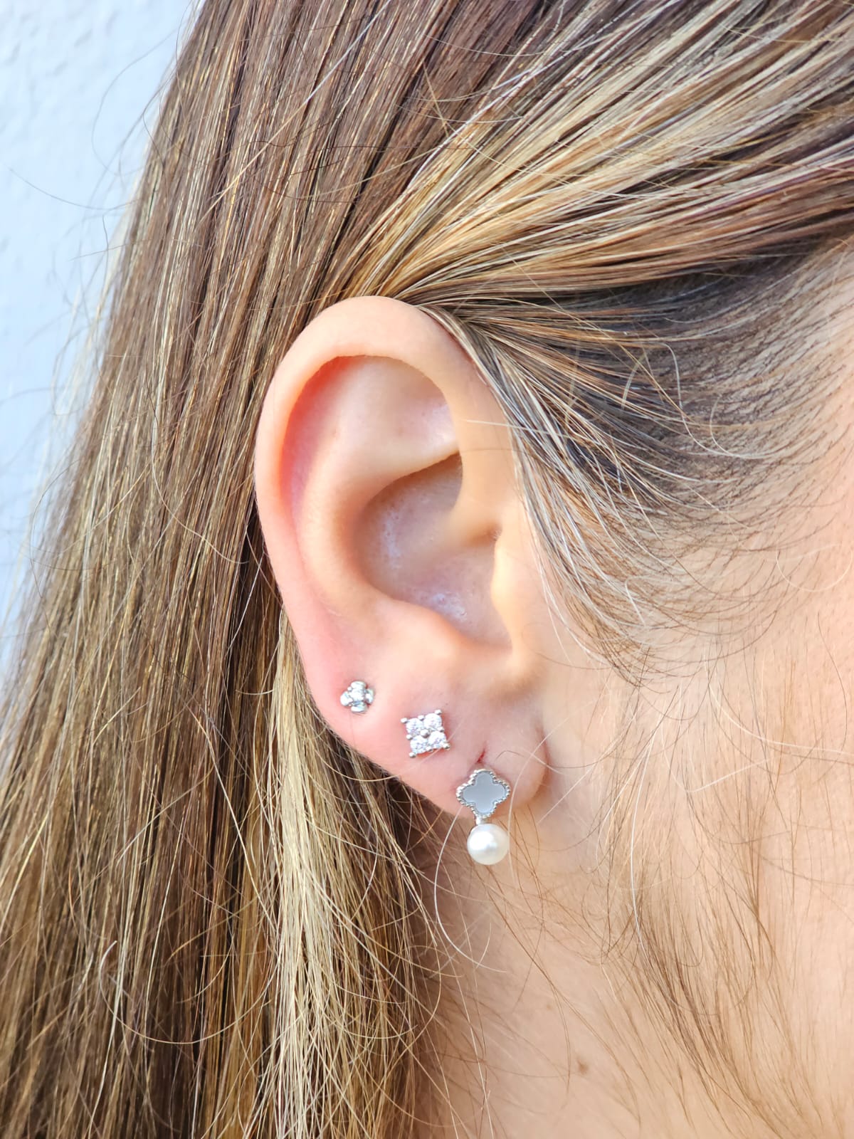 Trio de brico composto por um brinco de trevo com pérola, um brinco quadrado com strass e um brinco de mini flor com centro de strass