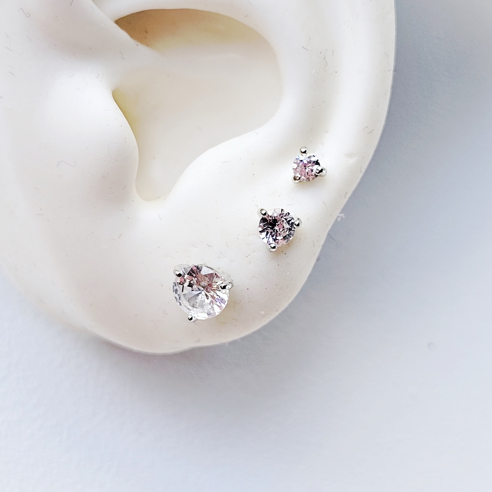 Trio de brincos pontos de luz com base de metal e garras segurando a pedra de zircônia transparente
